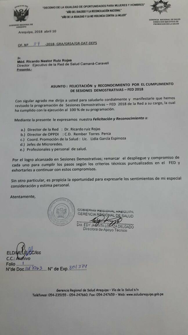 El Equipo de Gestión de la Red de Salud Camaná Caravelí, saluda y agasajan al Dr. Ricardo Ruiz Rojas Director Ejecutivo, en el Día de la Medicina, deseándole éxitos en el desempeño de su noble profesión y en el cargo que actualmente ocupa, brindándole todo el apoyo en bien de Nuestra Institución.