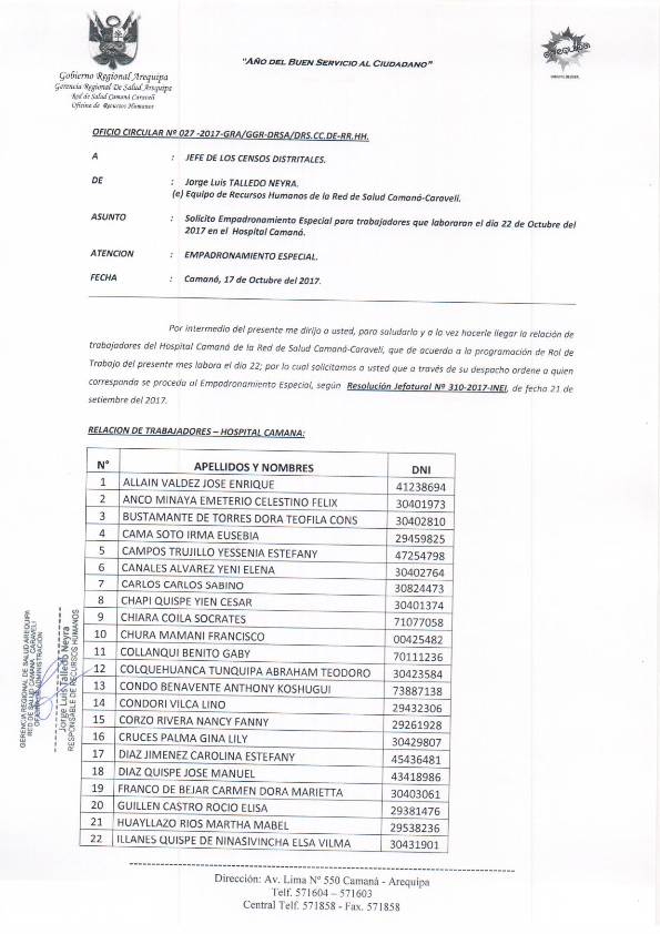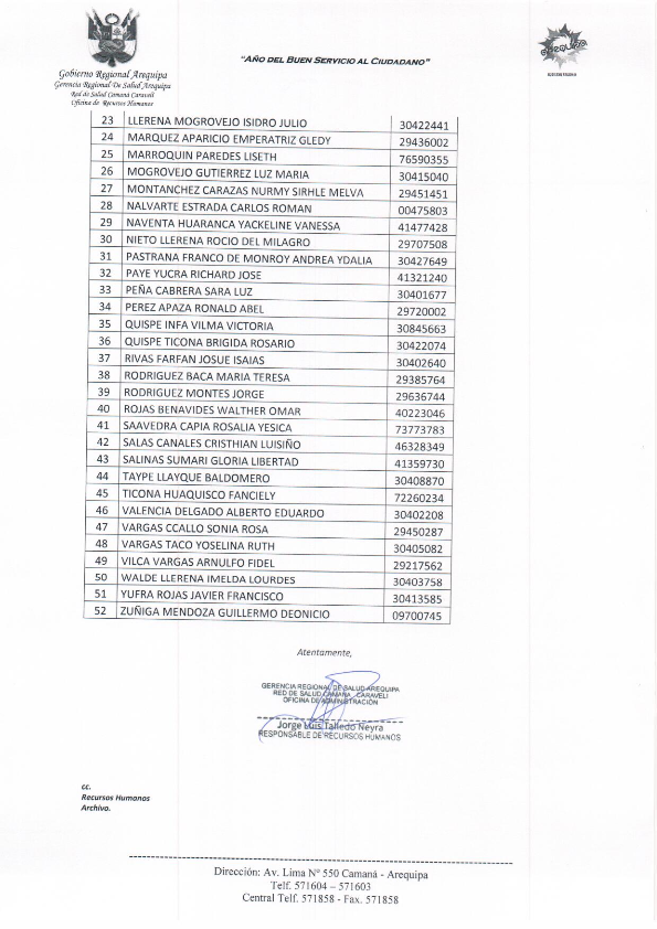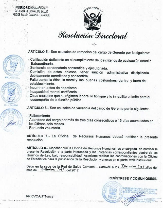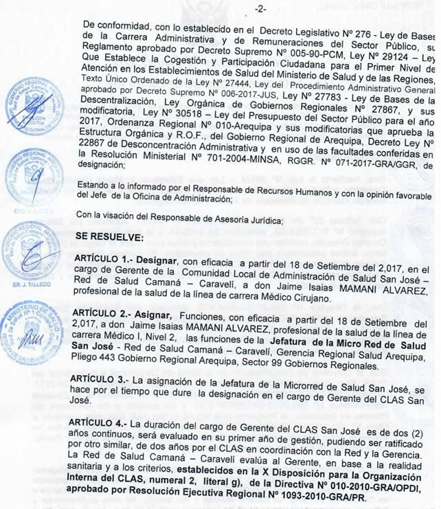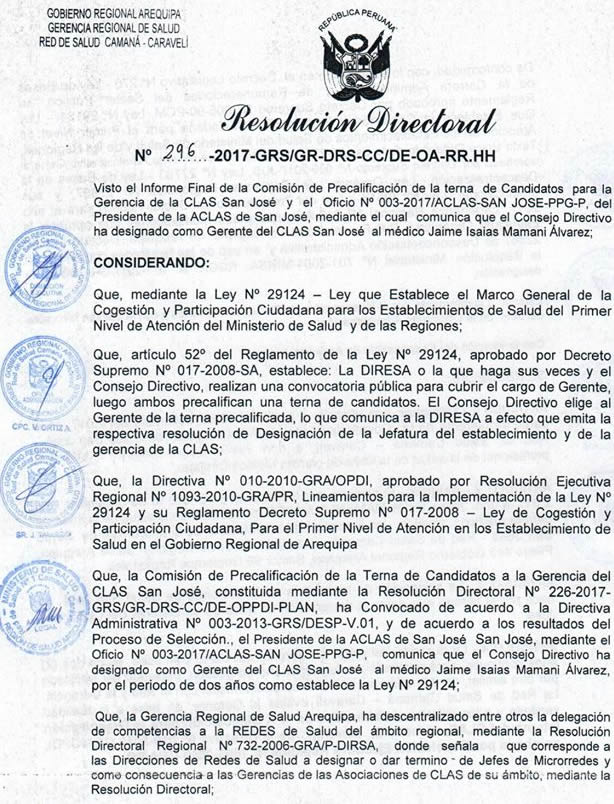 El Director de la Red de Salud Camaná - Caravelí Dr. Ricardo Ruiz Rojas y la Comisión de Precalificación a la Gerencia CLAS SAN JOSE, Dr. Rember Torres Perca, Abog. Ángel Villalobos Maldonado, Lic. Giovana Aragón Mamani, Lic. Milagros Ramos Arismendi, realizaron la Entrega de Resolución Directoral 296-2017-GRS/GR-DRS-CC/DE-OA-RR.HH al nuevo GERENTE de la Micro Red de Salud SAN JOSE DR. JAIME ISAIAS MAMANI ALVAREZ, a partir del 18 de Setiembre del 2017.