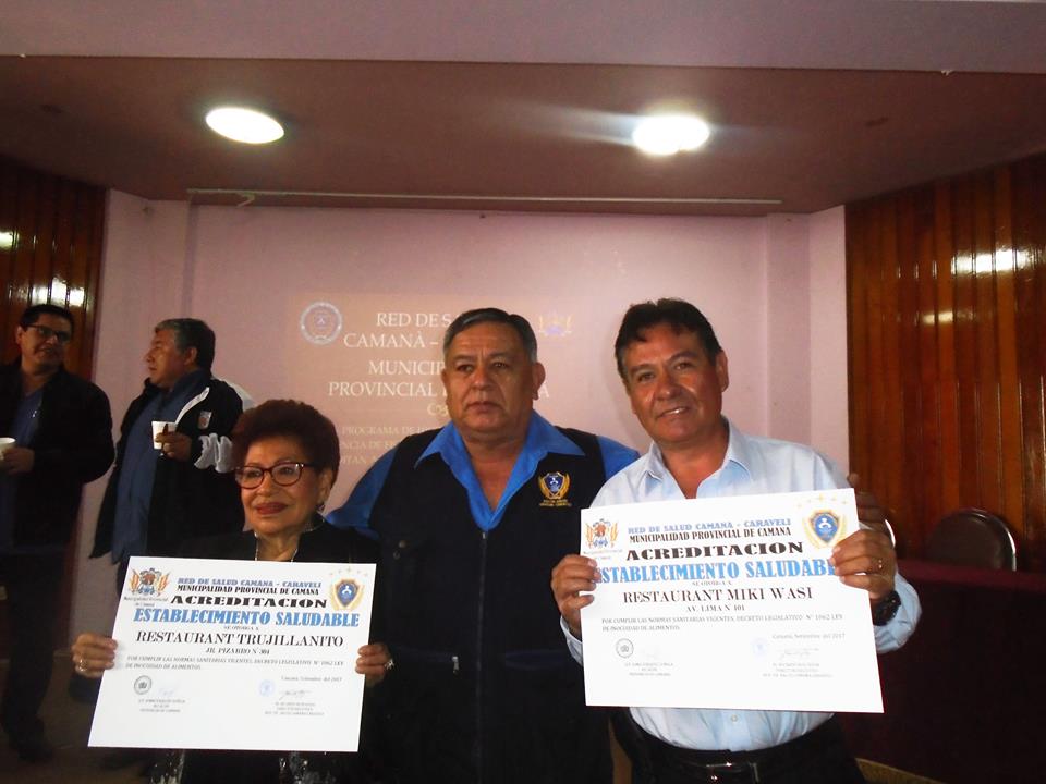 El Dr. Ricardo Ruiz Rojas, Director Ejecutivo de la Red de Salud Camaná Caravelí, Dr. Jose Antonio Llamosas Ampuero, Director del Hospital de Camaná, Director OPPDI Odont. Rember Torres Perca, Inspector Sanitario Raul Alfaro Escalante, en coordinación con la Municipalidad Provincia de Camaná, llevaron acabo la "ACREDITACIÓN A LOCALES SALUDABLES QUE MANIPULAN Y EXPENDEN ALIMENTOS 2018".