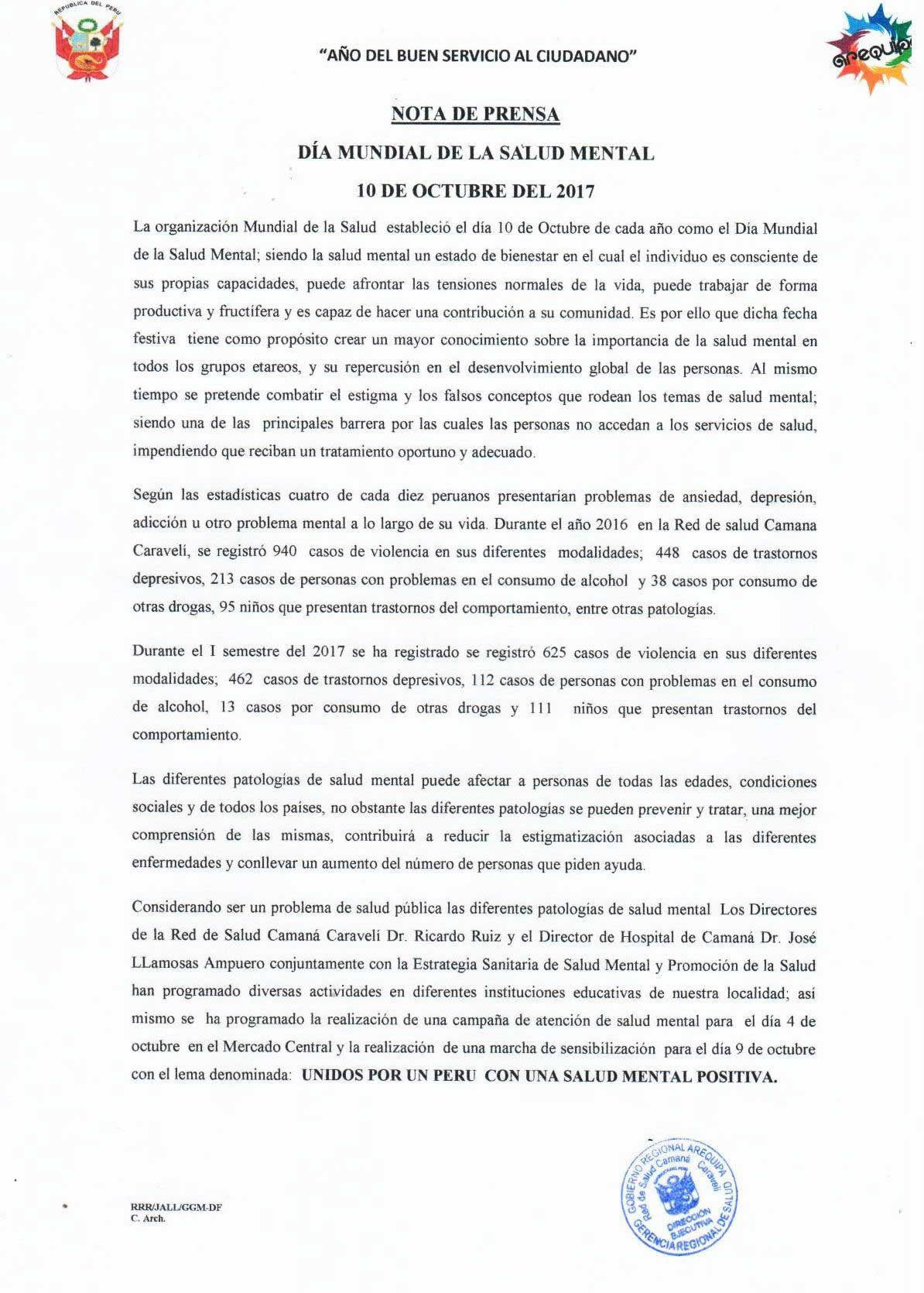 NOTA DE PRENSA DÍA MUNDIAL DE LA SALUD MENTAL 10 DE OCTUBRE DEL 2017.