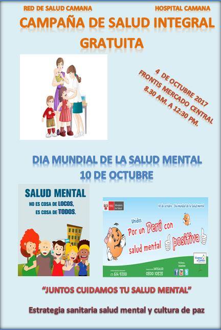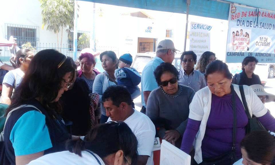POR CONMEMORARSE EL DÍA DE LA SALUD MENTAL LA RED DE SALUD CAMANÁ CARAVELÍ, HOSPITAL DE APOYO CAMANÁ EN COORDINACIÓN CON LA MUNICIPALIDAD PROVINCIAL DE CAMANÁ REALIZO UNA CAMPAÑA INTEGRAL GRATUITA EN EL MERCADO CENTRAL, EN DONDE SE OFRECIERON DIFERENCIAS SERVICIOS DE SALUD COMO CONSULTAS MEDICAS, CONSULTAS PSICOLÓGICAS, EXÁMENES ODONTOLOGICOS, INSTRUCCIÓN DE HIGIENE ORAL, DESCARTE DE DIABETES E HIPERTENSION, TOMA DE PRUEBAS DE VIH, CONSEJERÍA EN CÁNCER , DESCARTE DE TBC, VACUNACION DE INFLUENCIA, TETANO Y PROMOCIÓN DE PRACTICAS DE ESTILOS DE VIDA SALUDABLES DIRIGIDO A LA POBLACIÓN DE CAMANÁ