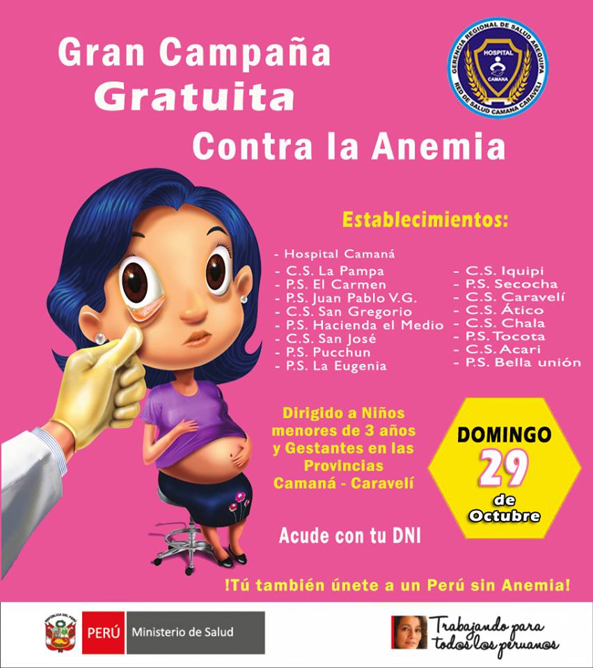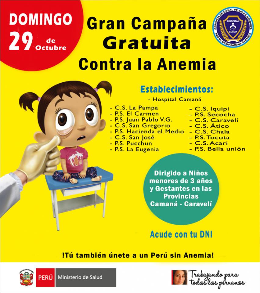 La red de salud Camaná Caravelí como parte del Plan Nacional para la Reducción y Control de la Anemia Materno Infantil y la Desnutrición Crónica Infantil 2017-2021 realizo la campaña correspondiente el día 16 de julio en la cual se realizó el despistaje de anemia en todos los niños, adolescentes, mujeres gestantes y puérperas.