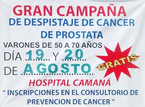 GRAN CAMPAÑA GRATUITA DE DESPISTAJE DE CÁNCER DE PRÓSTATA, 19 Y 20 DE AGOSTO - HOSPITAL CAMANÁ. INSCRIPCIONES EN CONSULTORIO PREVENCIÓN DE CÁNCER.