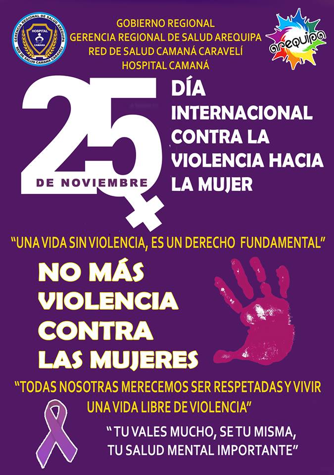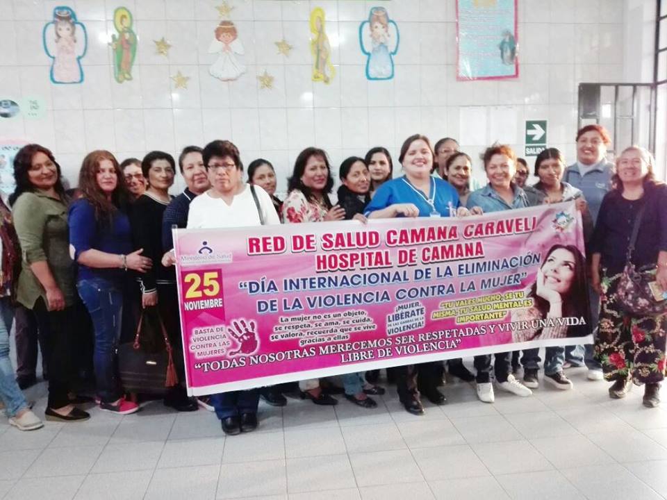 Por Conmemorarse el Día Internacional de la Eliminación de la Violencia Contra la Mujer, este 25 de Noviembre, la Red de Salud Camana Caraveli ,desarrollo una serie de actividades preventivas promocionales con la finalidad de continuar con la sensibilización para el abordaje de este problema de salud pública y poder detectar y prevenir todo tipo de maltrato en los diferentes grupos etáreos y así lograr estilos de vida saludables en nuestra población. "No mas Violencia contra la Mujer"
