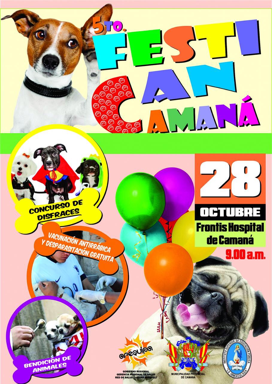 La Red de Salud Camana Caravelí en coordinación con la Municipalidad provincial de Camana y el Instituto Superior realizara el quinto Festican de Camana, para incentivar la tenencia responsable de mascotas y la eliminación de la rabia canina. Se llevara a cabo en el frontis del hospital de Camana. El día 28 de octubre a partir de las 9:00 am. Habrá grandes premios por parte de las clínicas veterinarias de Camana.
