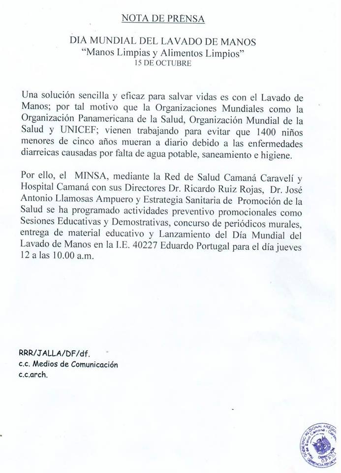 NOTA DE PRENSA DÍA MUNDIAL DEL LAVADO DE MANOS "MANOS LIMPIAS Y ALIMENTOS LIMPIOS" DÍA JUEVES 12 A LAS 10.00 A.M.
