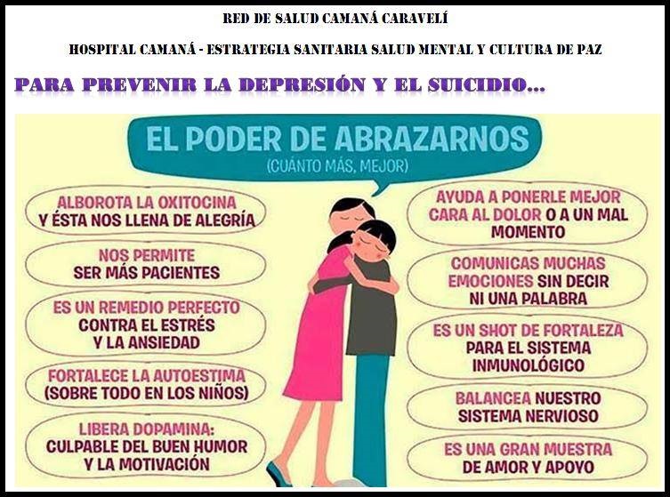 El día 10 de Setiembre, por Conmemorarse el Día Mundial de la Prevención del Suicidio la Red de Salud Camaná Caravelí a través del Programa Control en la Prevención en la Salud Mental en coordinación con el Servicio de Psicología del Hospital de Camaná, realizaron una serie de actividades por dicha fecha festiva. El lema de este año es : TOMA MI MANO, ESTOY CONTIGO: EL SUICIDIO SE PUEDE PREVENIR” con el objetivo de fomentar los lazos afectivos, ofrecer apoyo, re valorar y fomentar el acto de mostrar preocupación por alguien vulnerable al suicidio, dichos actos son un punto de cambio ya que son factores protectores contra el suicidio.