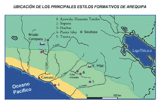 La llamada formación Cocachacra representa al Paleozoico, mientras que entre Yura y Tambo se encuentran muestras del Volcánico Chocolate.