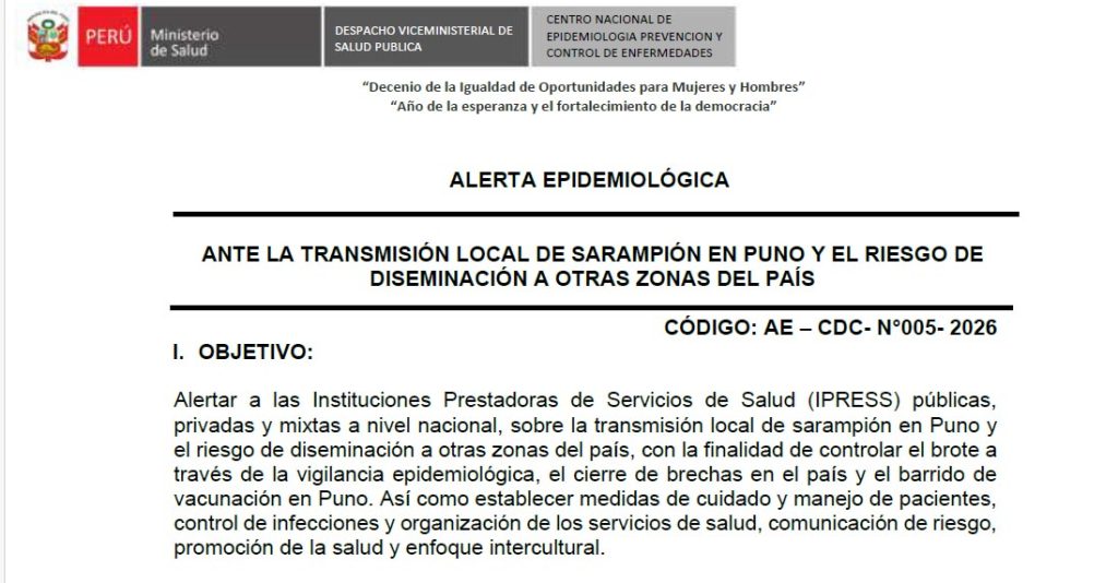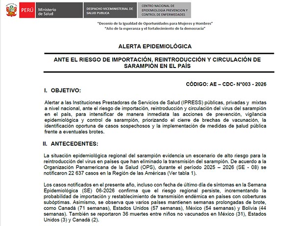 06/03/2026 : ALERTA EPIDEMIOLÓGICA AE – CDC- N°003 – 2026: ANTE EL RIESGO DE IMPORTACIÓN, REINTRODUCCIÓN Y CIRCULACIÓN DE SARAMPIÓN EN EL PERÚ