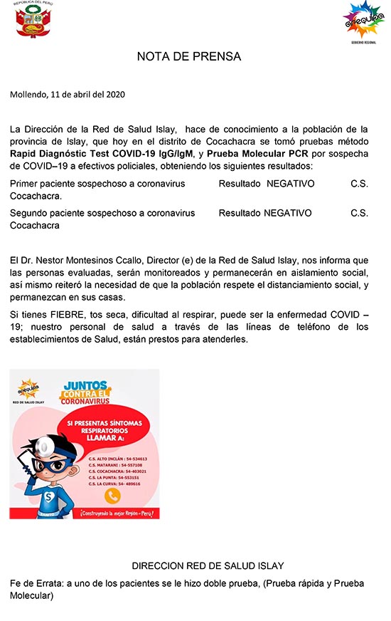 Considerando todo ello llamamos a la población que labora en el Puerto de Matarani a la calma, ya que como Sector Salud la vigilancia epidemiológica será permanente.