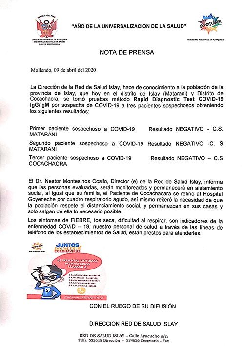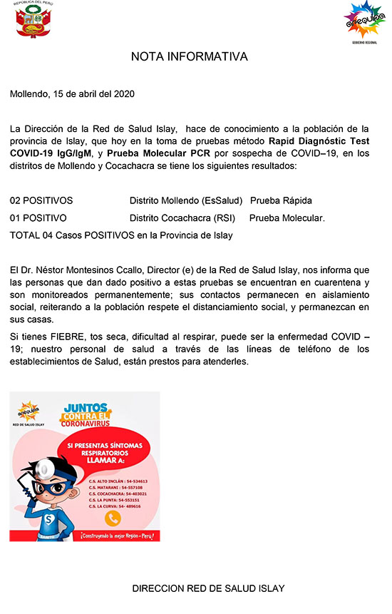 La Red de Salud Islay, hace de conocimiento a la población de la provincia y nuestros visitantes que se ha activado los Planes de Prevención recomendados por el Ministerio de Salud (MINSA), ante la emisión de la Alerta Epidemiológica a nivel Nacional, para prevenir en los puntos de entrada el ingreso del CORONAVIRUS.